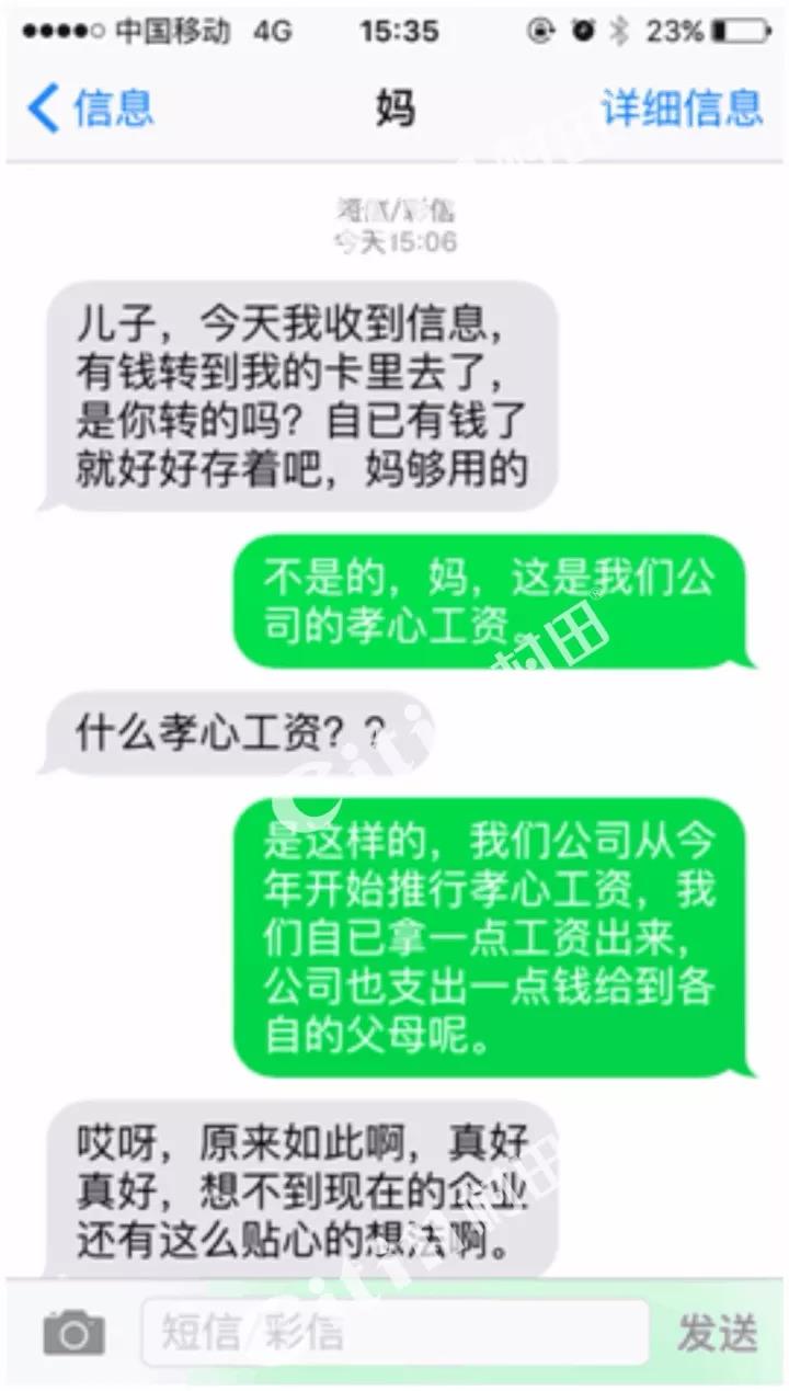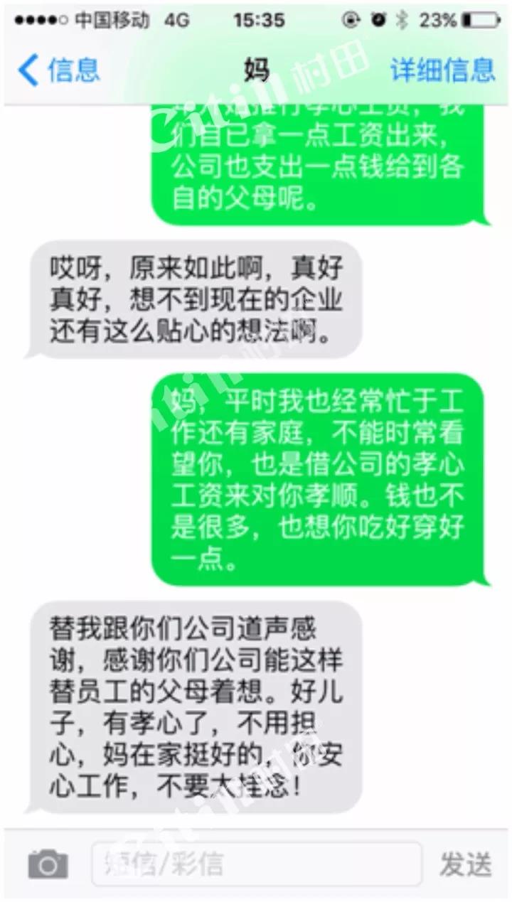 【员工1】:我是很支持这样的做法的!能够让我时刻记得养育父母的职责所在,警醒自己对家人的关爱和孝敬,现在给的是很少,但是以后自己有能力了就会给家人更多的孝敬。