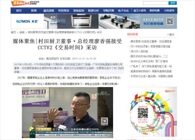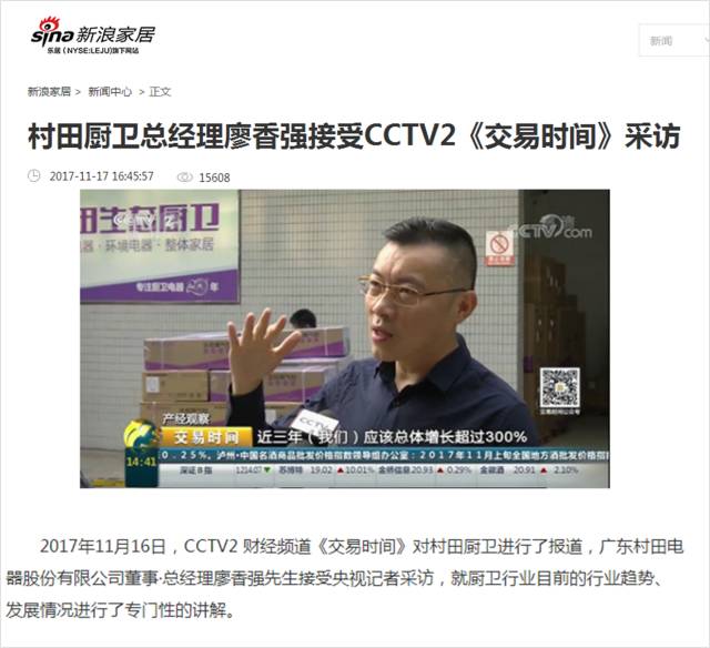 2017年11月16日,CCTV2财经频道《交易时间》、《整点财经》对开云·体育 (kaiyun)官方网站_kaiyun sport厨卫进行了报道,广东开云·体育 (kaiyun)官方网站_kaiyun sport电器股份有限公司董事·总经理廖香强先生接受央视记者采访,就厨卫行业目前的行业趋势、发展情况进行了专门性的讲解。
