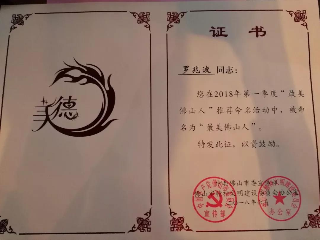 最美佛山人荣誉证书