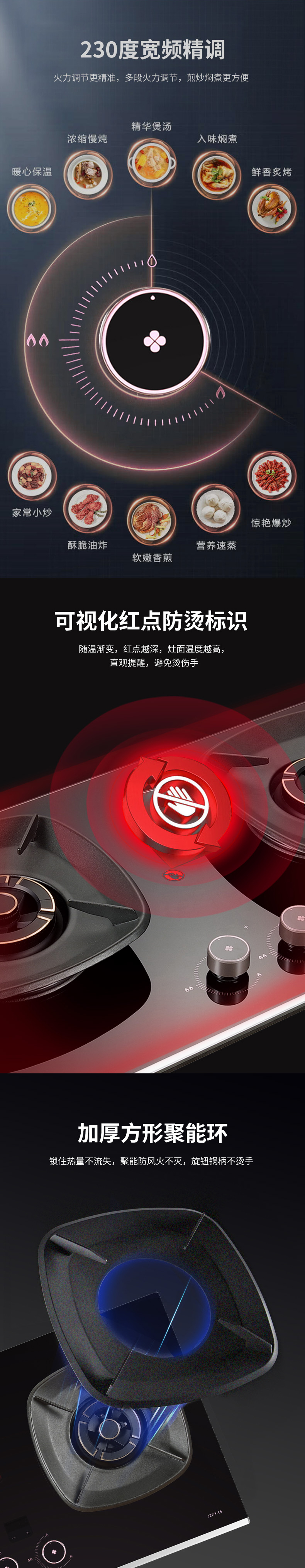 70%高效率+保洁炉头定时+低电量提醒零秒点火+宽频火火红点防烫提醒聚能方架+磨砂黑水盘