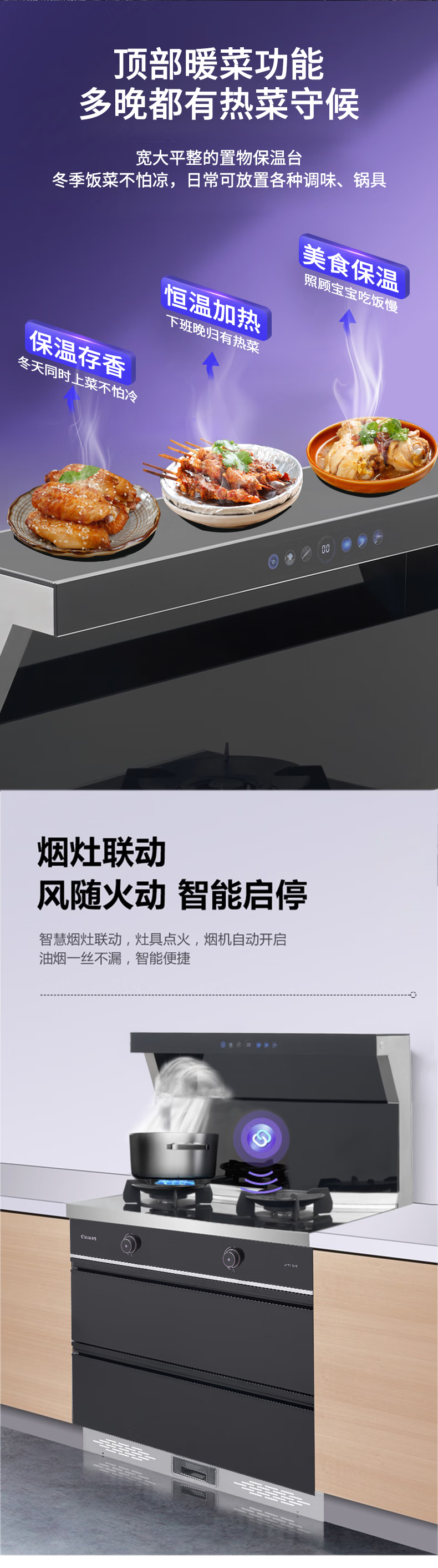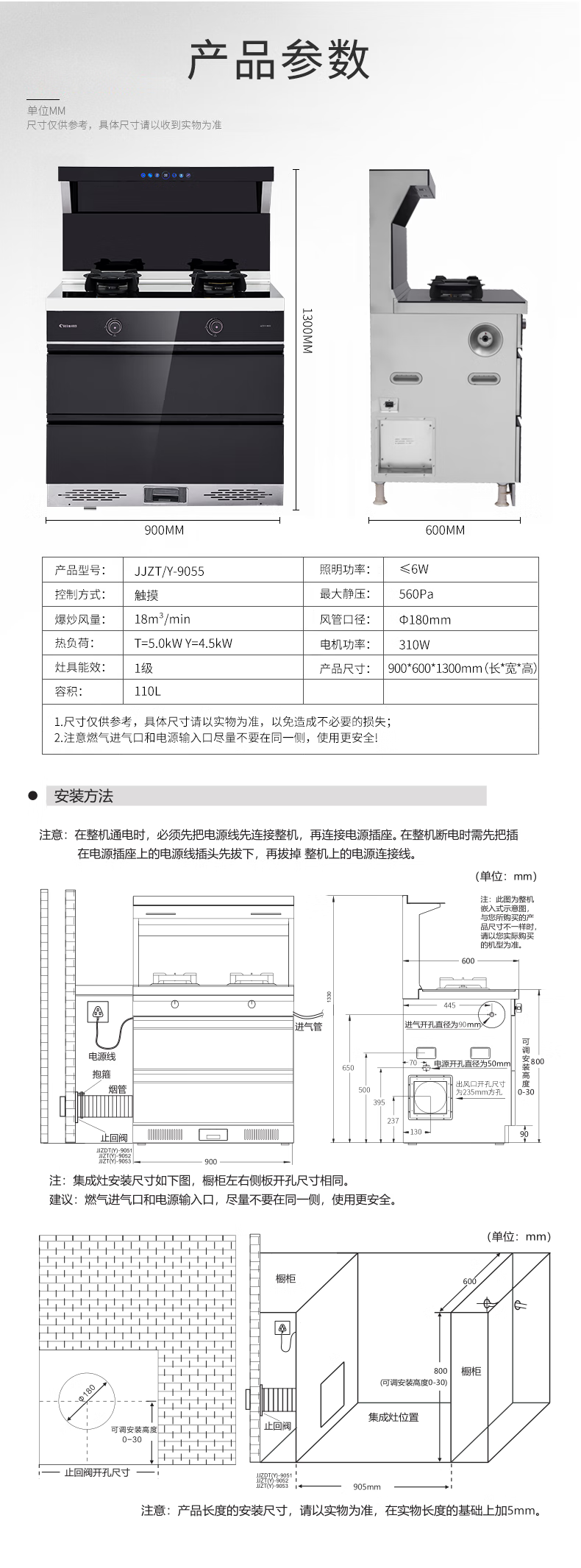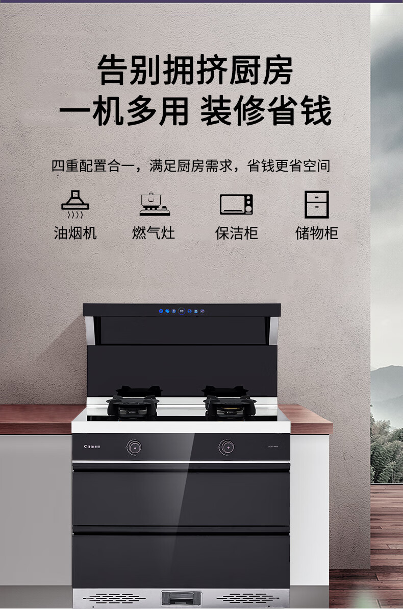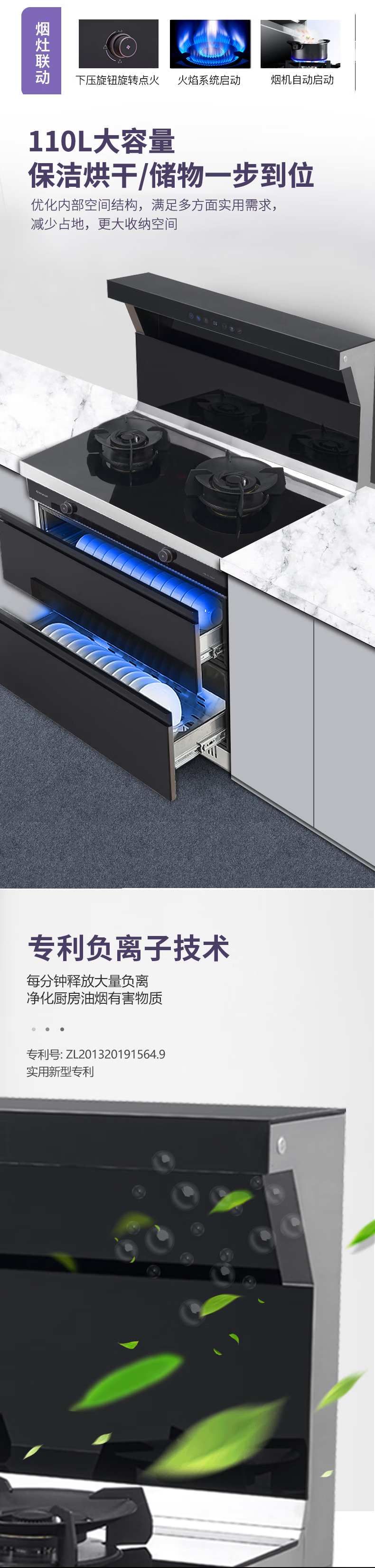 "负离子净化空气彩屏+挥手启停烟灶联动+暧菜宝防火墙+热除油防烫红点功能聚能锅支架" "能效等级:1级最大风量:19m³/min最大风压:570Pa 热负荷:T=5.0kW Y=4.5kW保洁柜容积:110L产品尺寸:900*600*1300"