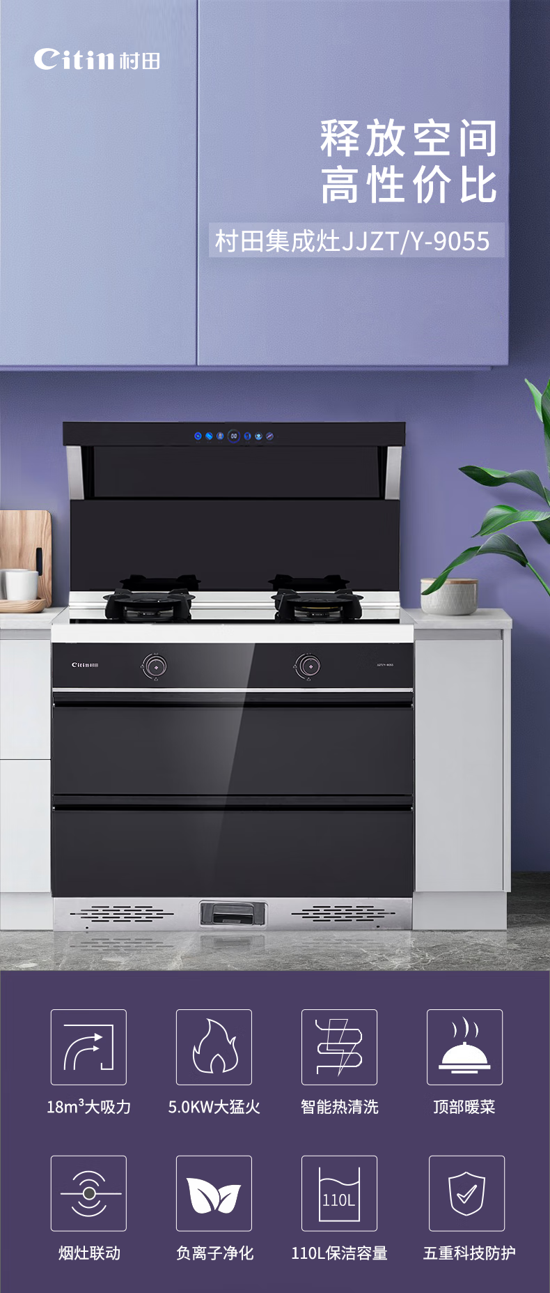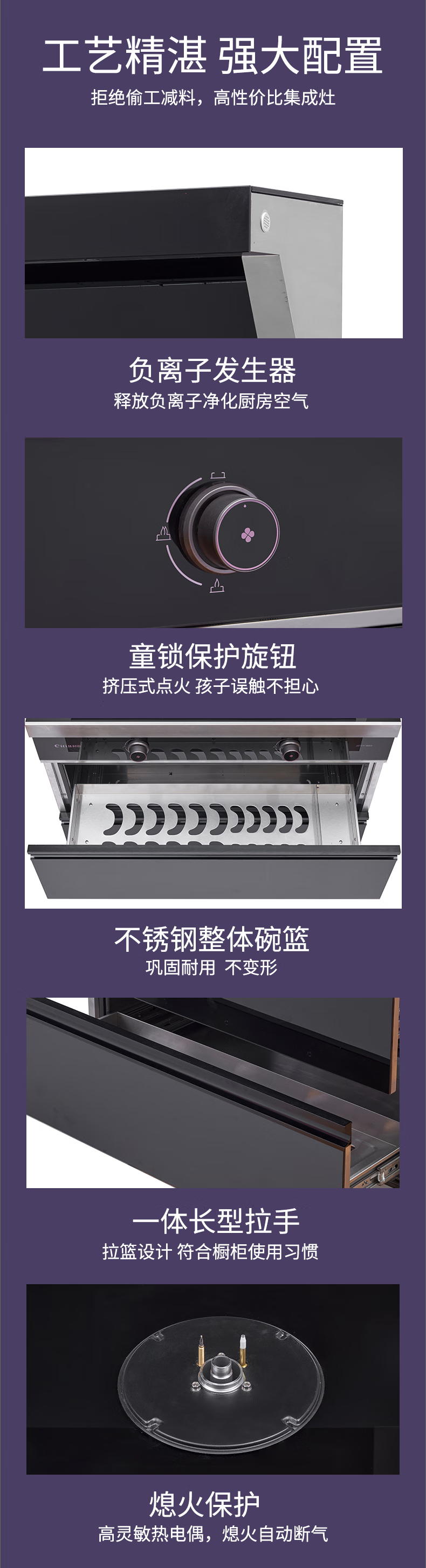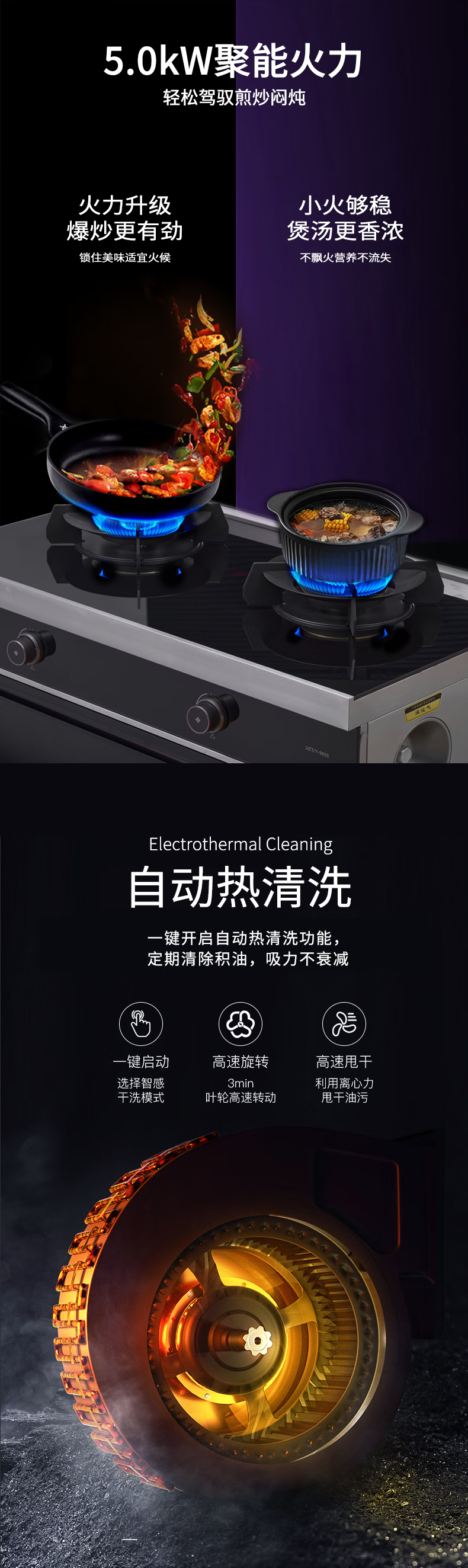 "负离子净化空气彩屏+挥手启停烟灶联动+暧菜宝防火墙+热除油防烫红点功能聚能锅支架" "能效等级:1级最大风量:19m³/min最大风压:570Pa 热负荷:T=5.0kW Y=4.5kW保洁柜容积:110L产品尺寸:900*600*1300"