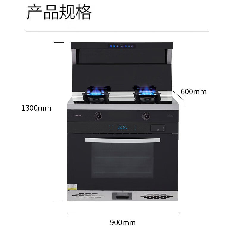 "蒸烤+空气炸+消负离子净化空气彩屏+挥手启停烟灶联动+暧菜宝防火墙+热除油防烫红点功能聚能锅支架" "能效等级:1级最大风量:19m³/min最大风压:570Pa 热负荷:T=5.0kW Y=4.5kW蒸烤容积:60L产品尺寸:900*600*1300"